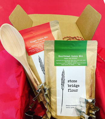 Stone Bridge Flour offers locally grown grains from our family farm and stone milled flour milled on site at our farm in Ripley, ON. We produce 7 types of flour: Everyday (all purpose), Bread, Cake & Pastry, Whole Grain, Spelt, Rye and Red Fife. We also make 11 types of baking mixes from cookies to scones to cakes. As well we have many baking accessories branded and beautiful to compliment your baking and cooking experience.